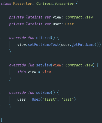 아래의 코드를 보면 fullName을 만들어내는 로직을 Model(User Class)로 분리하였기 때문에 Activity는 View와 클릭 이벤트만을 처리하는 모습으로 바뀌었습니다. 하지만 MVC의 경우, Model과 View사이의 의존성이 발생하기 때문에 앱이 커질수록 복잡해지게 됩니다.