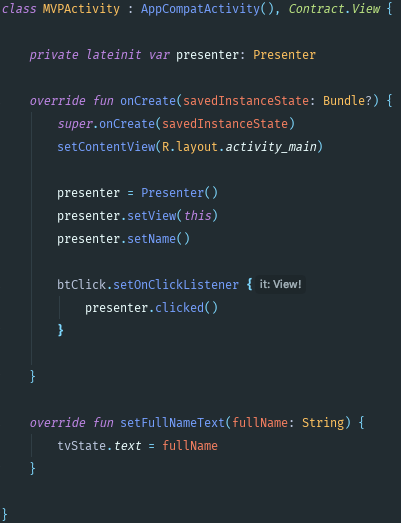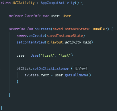 아래의 코드를 보면 fullName을 만들어내는 로직을 Model(User Class)로 분리하였기 때문에 Activity는 View와 클릭 이벤트만을 처리하는 모습으로 바뀌었습니다. 하지만 MVC의 경우, Model과 View사이의 의존성이 발생하기 때문에 앱이 커질수록 복잡해지게 됩니다.